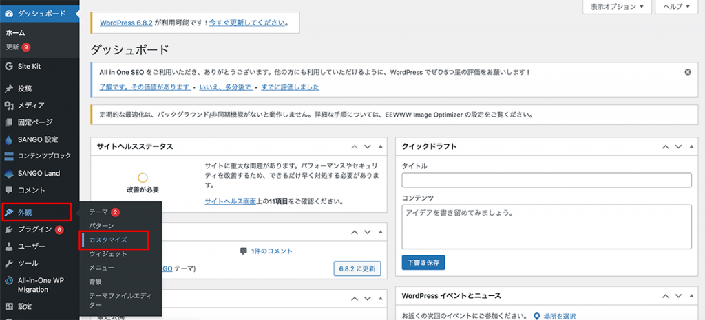 2.左メニュー「外観」→「カスタマイズ」をクリック