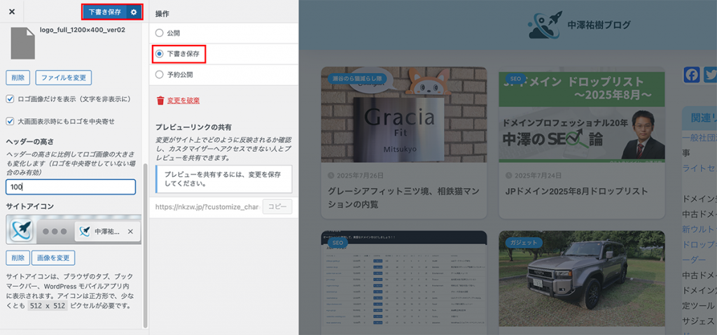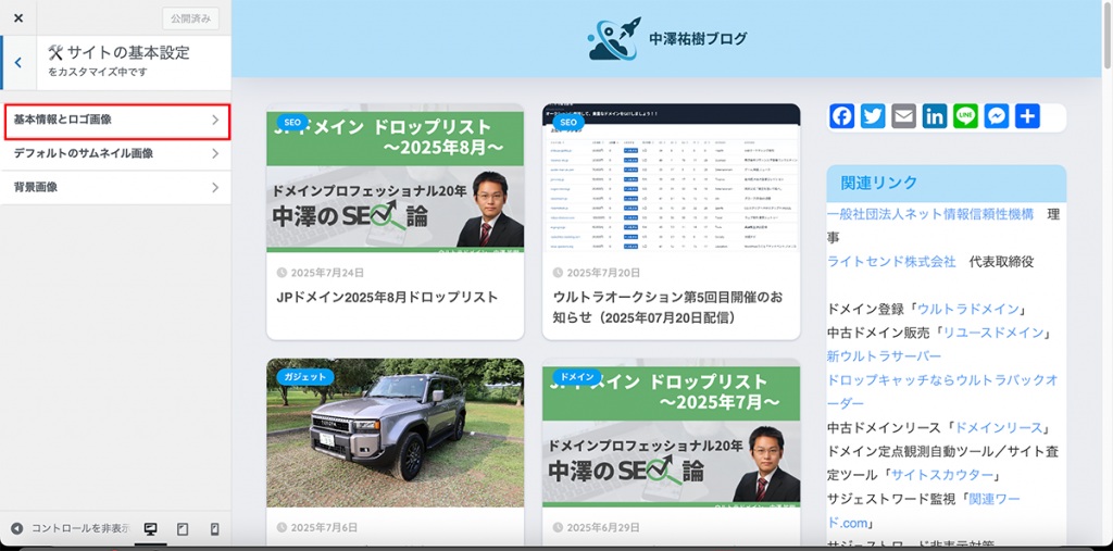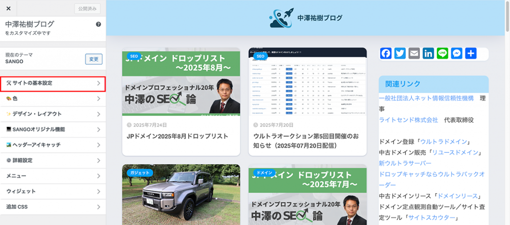 SANGOテーマでは、このカスタマイザーからロゴやファビコンを設定できます。