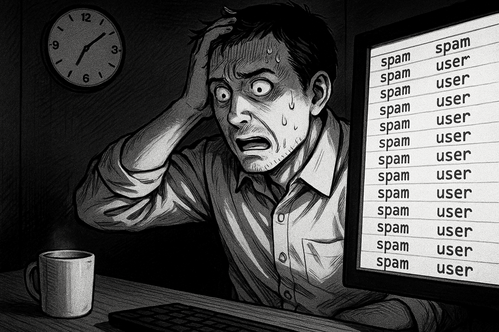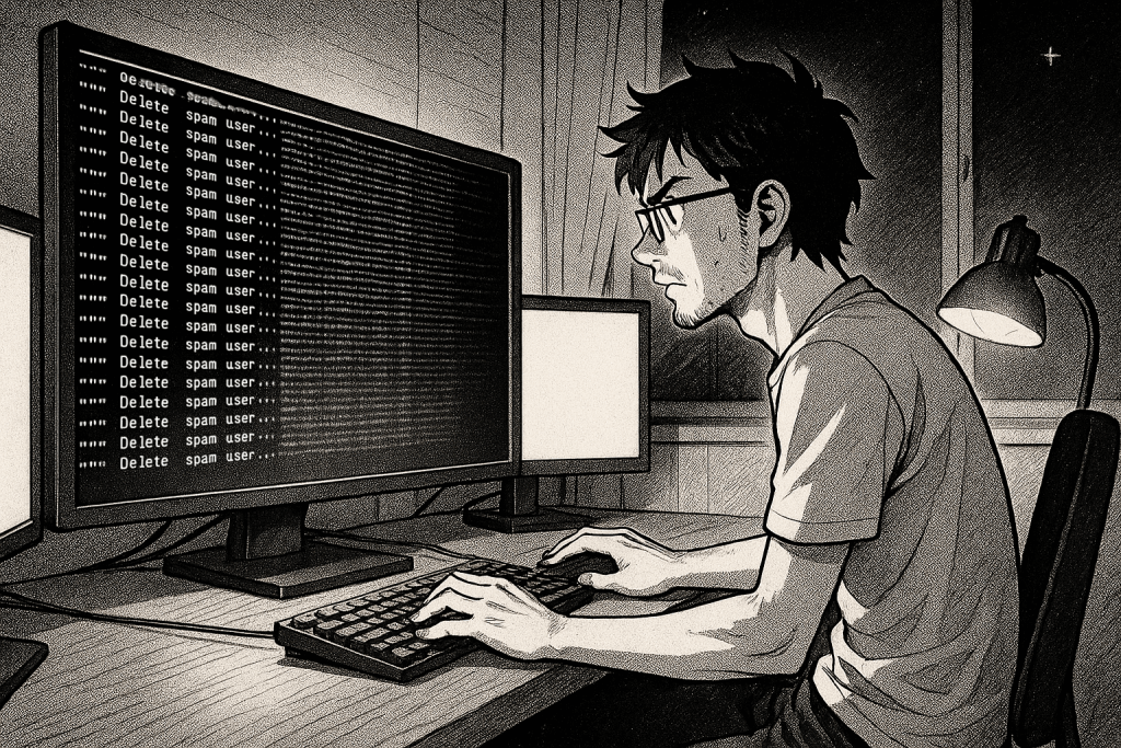 引き継いだサイトの管理画面を見て、一瞬、何かのバグかと思った。ユーザー一覧。そこには、ロシア語や中国語の、明らかにスパムと分かるメールアドレスがびっしりと並んでいた。スクロールしてもスクロールしても終わらない。1万件以上。全部、ボットが作ったゴミデータだ。